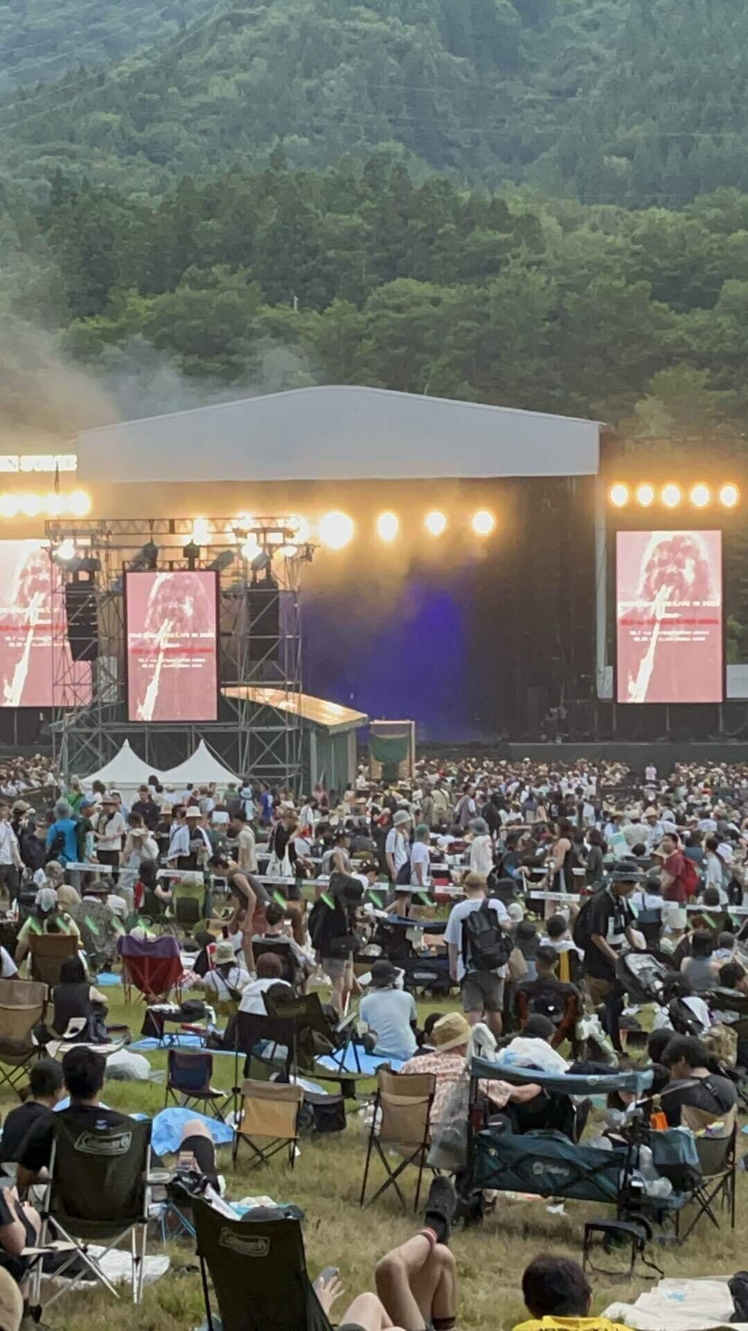グリーンで場所を確保して休んでいると、最前列の入れ替えでかなり揉めていた。「押さないでください、死人が出ます!」なんて声が飛ぶのも久々だった。その後、機材トラブルで開演が1時間以上遅れるとアナウンスがあり、Ezra Collectiveに流れる人が多かった。この待ち時間はキツかった。ドコモの電波も死んでいたし。
